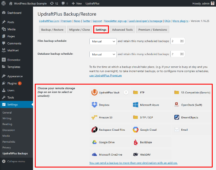 - چندین مکان ذخیره خارج از سایت. به عنوان مثال ، می توانید از سایت خود به طور همزمان در Google Drive و Amazon S3 پشتیبان تهیه کنید.