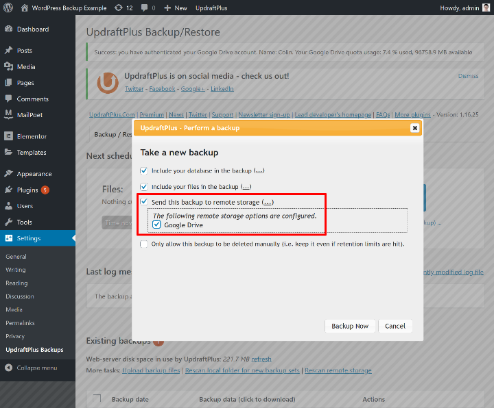از آن جا که این اولین پشتیبان شما است، هر دو کادر را انتخاب کنید. سپس، روی دکمه Backup Now کلیک کنید: