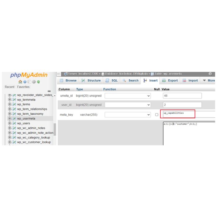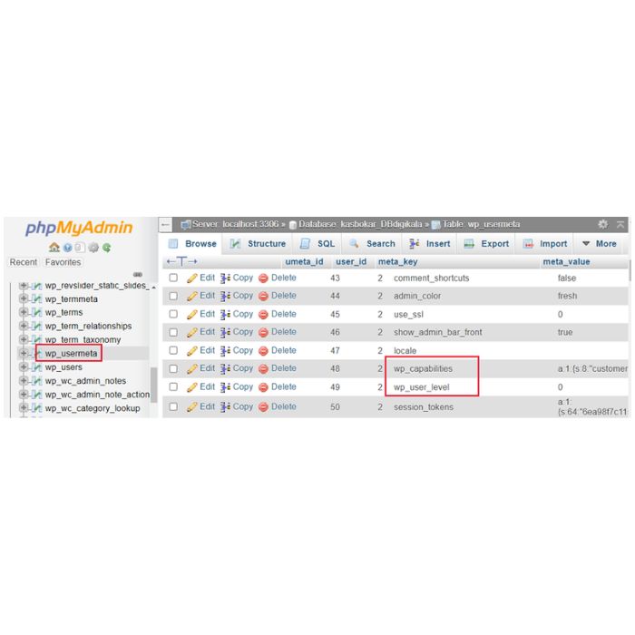 در مرحله آخر جدول usermeta را از دو بخش wp_capabilities و wp_user_level، براساس روش‌های گفته شده ویرایش کنید.