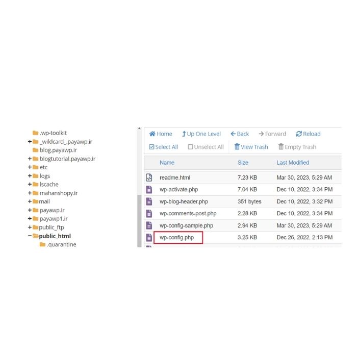 در این مرحله ابتدا به File Manager بروید و سپس به بخش public_html رفته و فایل wp-config.php را ویرایش کنید.