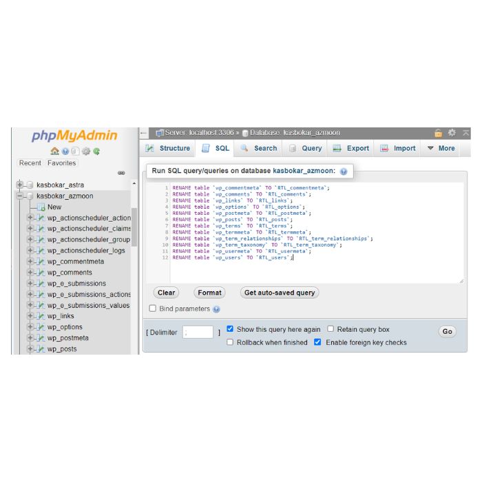 ابتدا دیتابیس وب‌سایت خود را انتخاب کرده و بعد روی گزینه SQL کلیک نمایید. در گام دوم با ویرایش دستورات SQL امکان تغییر پیشوند جداول وجود دارد.