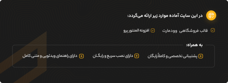 با خرید این پکیج، شما بهصورت منظم به جدیدترین نسخه قالب و افزونههای پرمیوم آن دسترسی خواهید داشت. همچنین پشتیبانی فنی نیز همراه شماست تا در صورت نیاز، به راحتی مسائل احتمالی را رفع کرده و سایت خود را با اطمینان کامل مدیریت کنید.