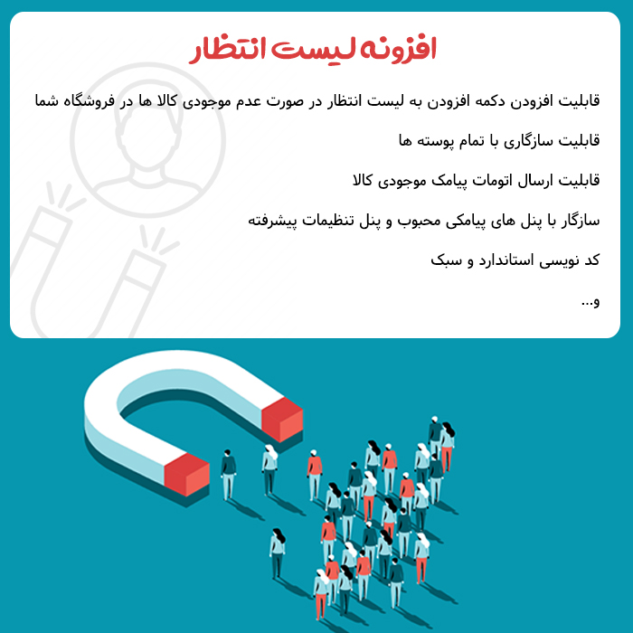 به کمک افزونه لیست انتظار ووکامرس روناک دیگر کاربران خود را از دست ندهید و همیشه پل ارتباطی فروشگاه اینترنتی خود با کاربرانتان را به صورت پیامکی حفظ نماید. هدف از به کار گیری افزونه لیست انتظار ووکامرس روناک ارتباط نزدیک تر با کاربران و تشویق به خرید از طریق فالوو آپ مشتریان است که در صورت ناموجود بودن محصولات کاربران شما را قادر میسازد تا با درج شماره تماسشان به محض موجودی مجدد محصول در انبار فروشگاه شما کاربران را باخبر و تشویق به خرید بنمایید. همچنین شما با پنل مدیریت این افزونه قادر خواهید بود که میزان محبوبیت کالا های ناموجود خود را بسنجید و محصلات محبوب تر را سریع تر در انبار فروشگاه خود شارژ نمایید، در نهایت استفاده از افزونه لیست انتظار ووکامرس روناک بسیار ساده است و با تمام وبسرویس های محبوب هماهنگی کامل را دارد و به راحتی میتوانید این افزونه را نصب و تنظیمات وبسرویس خود را انجام دهید، و شروع به استفاده ازین افزونه بنمایید مطمئننا پس از مدتی استفاده از افزونه شما شاهد افزایش فروش و همچنین افزایش ارتباط کاربران وبسایت و خو گرفتن بیشترشان با وبسایت میشوید که در نهایت باعث افزایش جلب اعتماد کاربران به مجموعه فروشگاهی شما میشود! نکته دیگری که با استفاده ازین افزونه میتوانید به آن دست یابید این است که بر اساس شماره های ورودی محصولات نا موجود فروشگاه خود آمار جالبی از میزان محبوبیت کالا های ناموجود خود به دست خواهید آورد و بر همین اساس سلیقه کاربرانتان به نوعی دستتان می آید و باعث میشود در کمپین های تبلیغاتی و پرومشن های فروشگاهتان تمرکز بیشتر و ویژه ای بر روی محصولاتی داشته باشید که حتی در زمان عدم موجودیشان استقبال بیشتری از آن ها شده است. از لحاظ ظاهری سعی شده که تا حد امکان فرانت افزونه بسیار مینیمال و سبک طراحی شود تا با اکثر پوسته های جدید و نوین که مینیمال هستند همخوانی کامل داشته باشد و باعث به وجود آمدن مشکلات افت سرعت و فراخوانی های زیاد نشود، همچنین افزونه لیست انتظار ووکامرس دارای چند انیمیشن برای نمایش فرم ثبت نام مشتریان است که باعث میشود با سلیقه شخصی خود انیمیشن دلخواه خودتان را انتخاب و استفاده نمایید. همچنین با استفاده از افزونه لیست انتظار ووکامرس و تنظیمات آن میتوانید میهمان های وبسایت خود را ترغیب به ثبت نام نمایید که پس از ثبت نام بتوانند شماره تماس خود را در لیست انتظار محصول مورد نظرشان وارد نمایند و یا کاربران میهمان سایت را آزاد بگذارید تا بدون نیاز به ثبت نام بتوانند شماره خود را برای لیست انتظار محصول مورد نظرشان وارد نمایند.